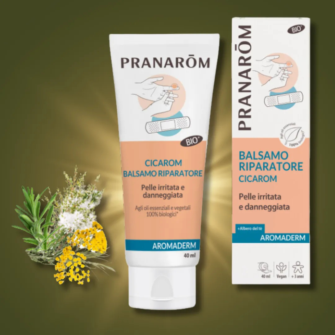 AROMADERM Cicarom Balsamo riparatore BIO* lenisce, protegge e favorisce la riparazione epidermica della pelle danneggiata : irritazioni, abrasioni, rossori, postoperatorio, cicatrici, screpolature. Indispensabile per tutta la famiglia.