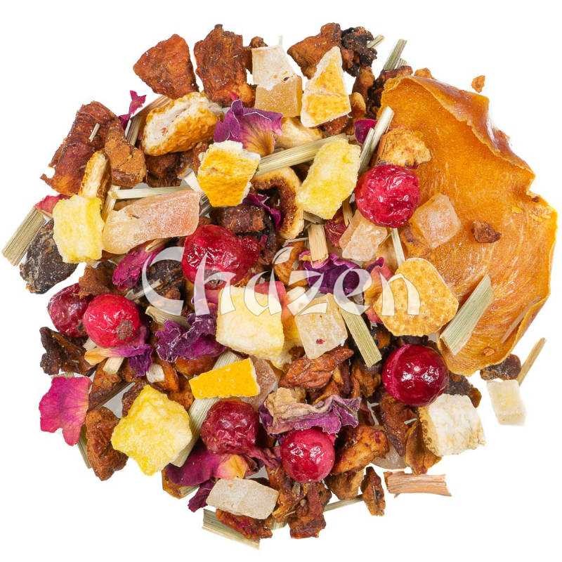 Ingredienti: pezzetti di mela (mela, acidificante: acido citrico), pezzetti di papaya candita (papaya, zucchero), scorze d’arancia, fette di cachi (10%), aromi, citronella, pezzetti di pesca (pesca, farina di riso) (10%), ribes rosso, foglie di fiori di rosa.