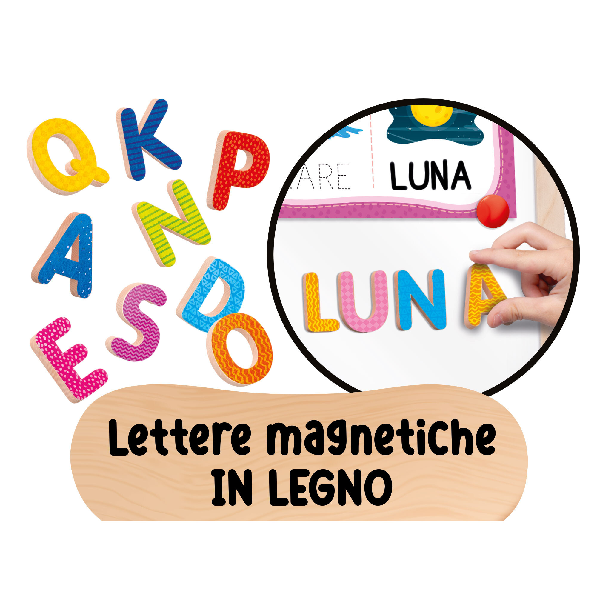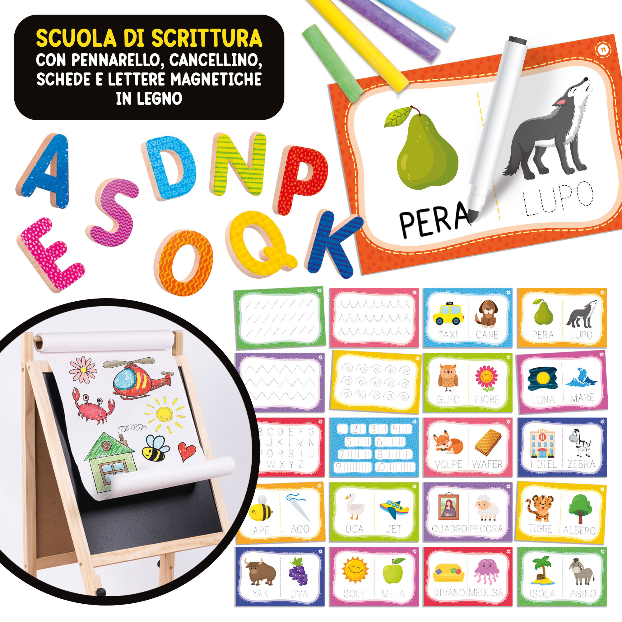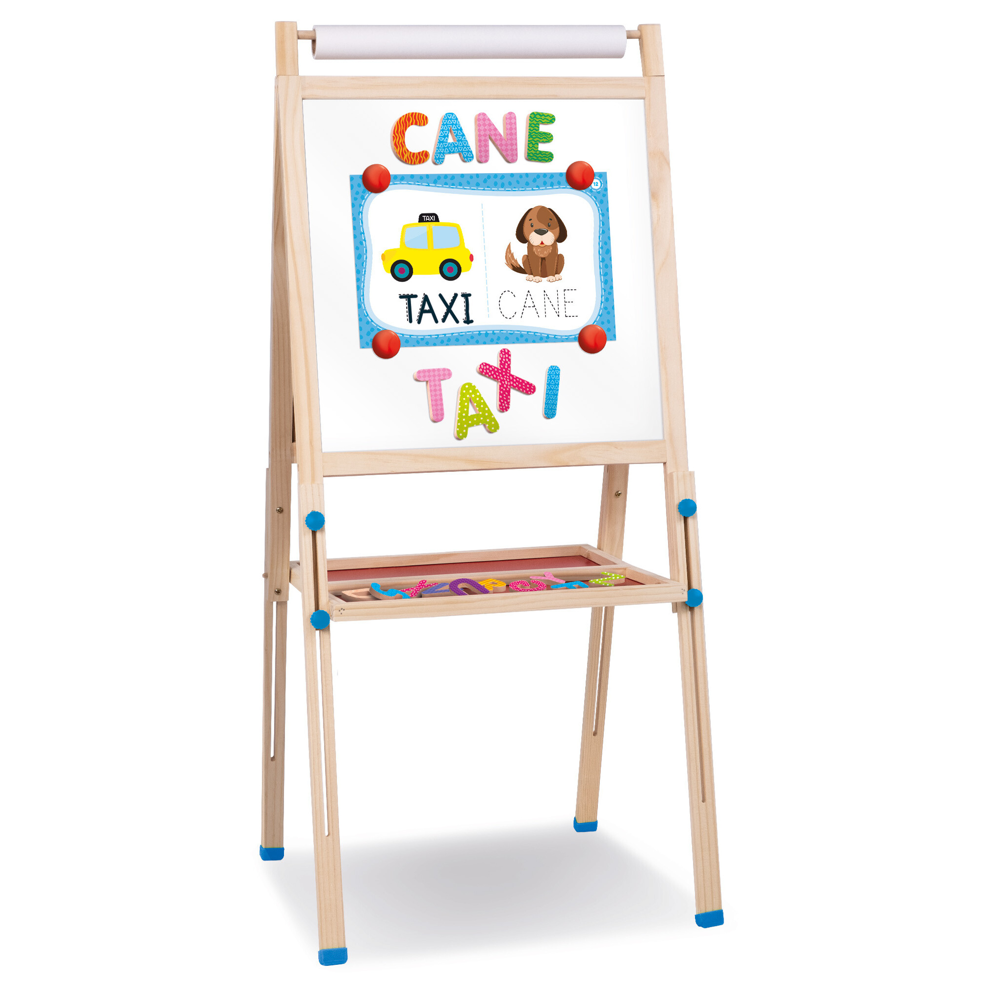 Una maxi lavagna da terra realizzata in legno di alta qualità. Con un ricco kit di giochi educativi, permette al bambino di imparare a leggere e scrivere