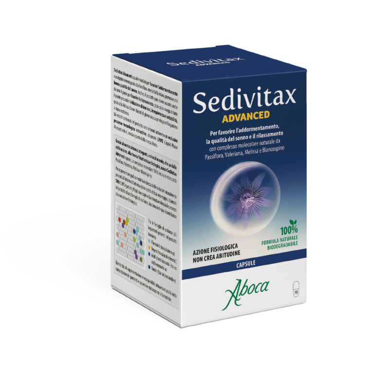 Sedivitax Advanced capsule è studiato per favorire l’addormentamento e un riposo sereno grazie alla Passiflora, mentre la Valeriana promuove una buona qualità del sonno.