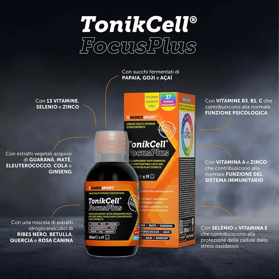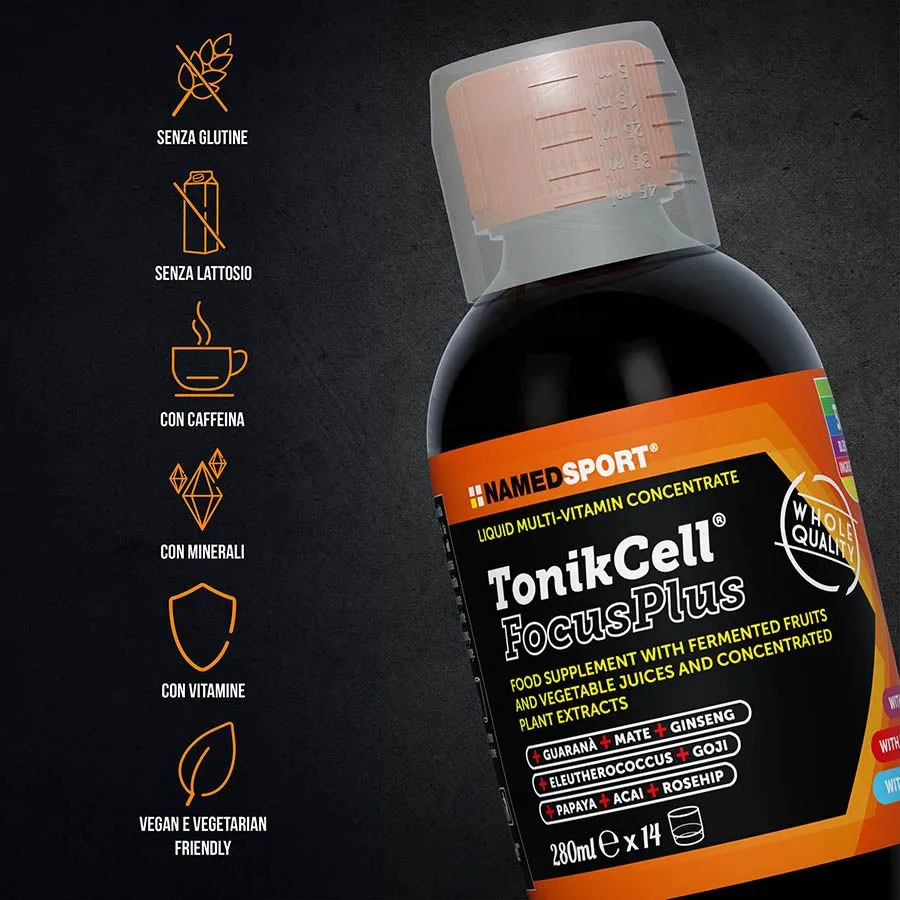 TonikCell® FocusPlus è un tonico multivitaminico in forma liquida unico nel suo genere, utile nei periodi caratterizzati da stress, stanchezza, scarsa concentrazione, affaticamento fisico e mentale e in tutte le situazioni in cui sia necessaria una carica di vitalità. TonikCell® FocusPlus è ideale anche nei periodi di attività sportiva intensa e duratura. Ricco di vitamine A, C, E e vitamine del gruppo B, TonikCell® FocusPlus è arricchito da una miscela di estratti acquosi e concentrati di guaranà, matè, cola, eleuterococco e ginseng, da un’esclusiva combinazione calibrata di estratti idrogliceralcolici composta da ribes, rosa canina, betulla e quercia e da succhi fermentati di goji, papaia ed açai.